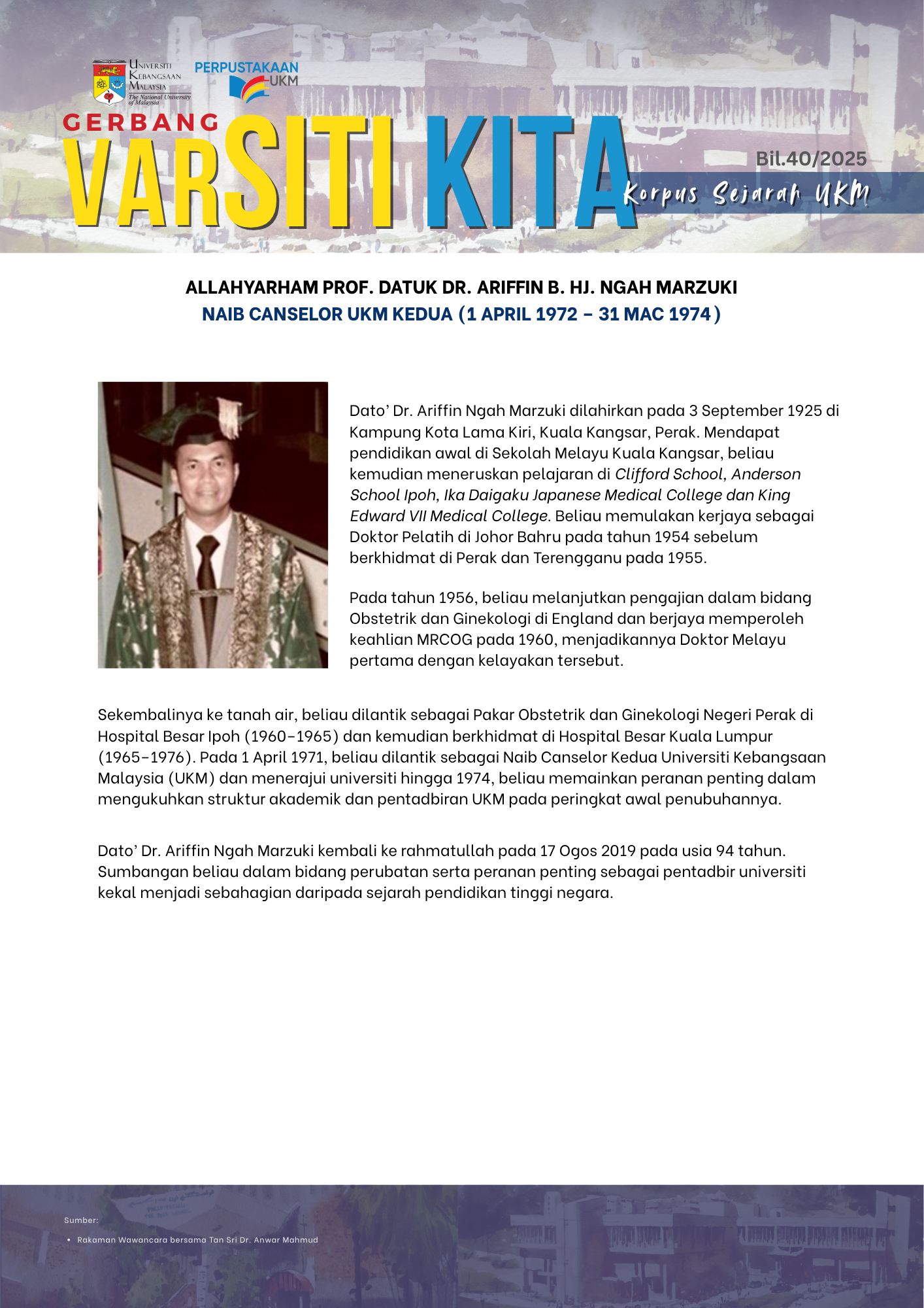 | Keywords: | Profil Naib Canselor UKM Allahyarham Prof. Datuk Dr. Ariffin B. Hj. Ngah Marzuki |