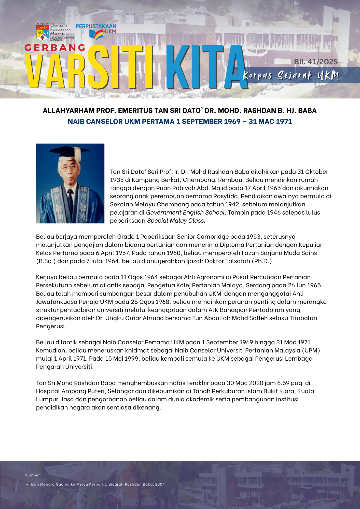 Title: Allahyarham Prof. Emeritus Tan Sri Dato’ Dr. Mohd. Rashdan B. Hj. Baba